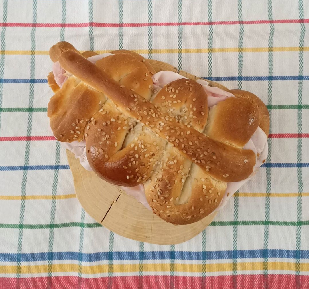 Un candido panino croccante fuori e morbido dentro, dalla inimitanile forma. E' la mafalda (o mafaldina). Non manca una spruzzata di ciciulena (i semi di sesamo). La trovate in tutti i panifici.